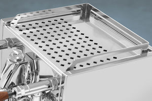 Nerūdijančio plieno rėmas, poliruotos aliuminio kojelės, didelis puodelių šildytuvas ir praktiškas lašėjimo padėklas.