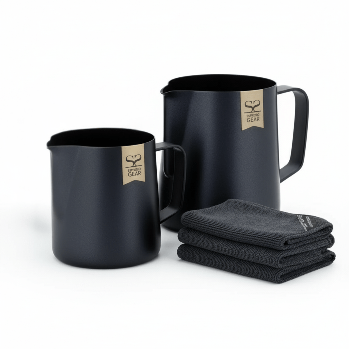 Neseniai įsigijai espressomatą arba svarstai investuoti? Šis pilnas pradinio rinkinio komplektas iš Espresso Gear suteikia viską, ko reikia, kad nuo pirmos dienos galėtum namuose kurti profesionalius kavos gėrimus. Su dviem matinės juodos spalvos pieno ąsočiais skirtingų dydžių ir trimis aukštos kokybės Barista rankšluosčiais gauni įrankius, kurių kiekvienam Barista reikia – elegantiško juodo apdailos, kuri papuoš tavo virtuvę.
