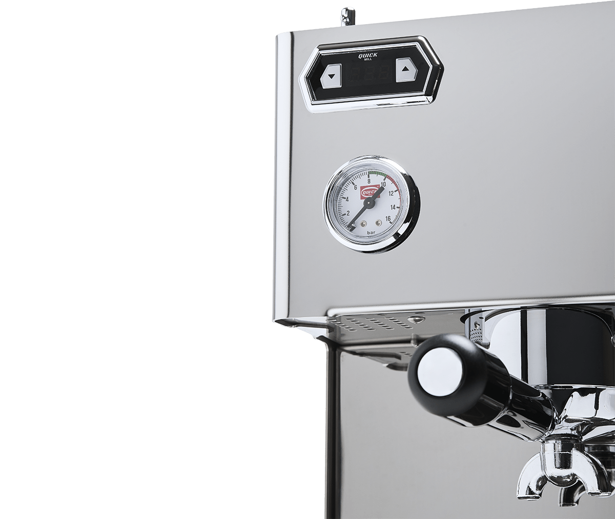 Manometras (0–16 bar) tiksliai rodo, kokiu slėgiu veikia siurblys, padedantis optimizuoti malimą, dozę ir tampavimą tobulam šotui.