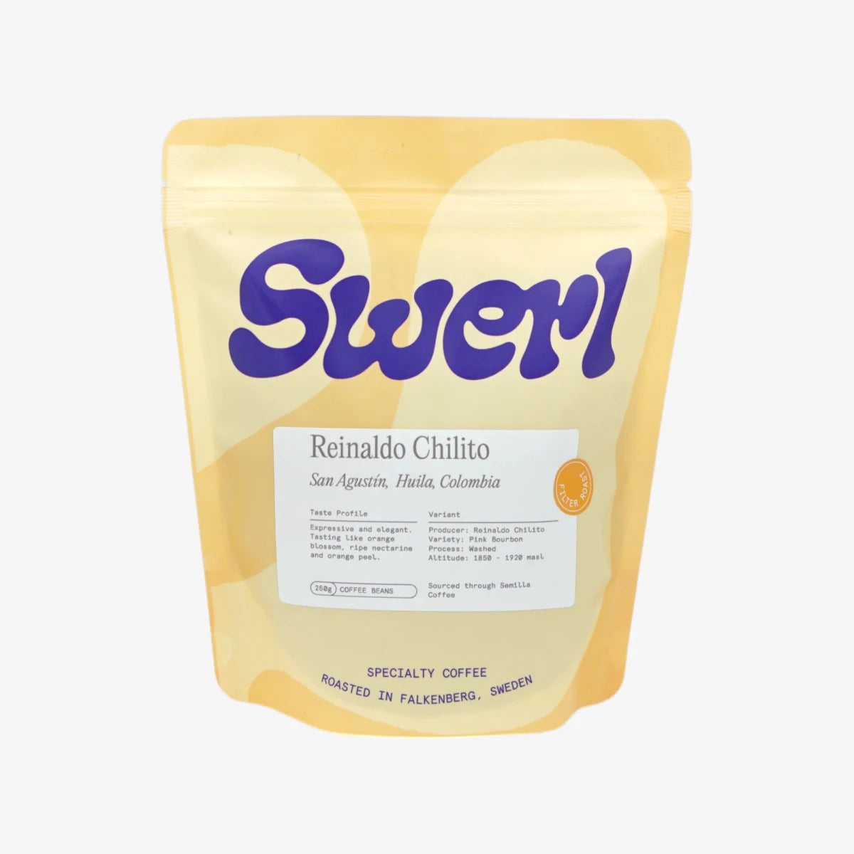 Ši kava turi TVÄTTAD ROŽINĖ BOURBON - APPELSINBLOMMA, SUNOKĘS NEKTARINAS, APELSINO ŽIEVELĖ natų.